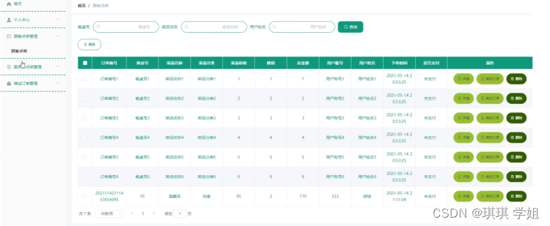 顾客点菜管理,在顾客点菜管理页面可以查看订单编号、餐桌号、菜品名称、菜品分类、菜品价格、数量、总金额、用户账号、用户姓名、下单时间、是否支付等信息,并可根据需要进行详情、删除等操作,如图5-21所示。