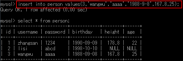 - insert into student (id,age,name,sex,score,birthday) values(null,23,'lisi','男',56.99,'1990-02-09');
