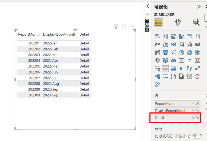 factCostControlCentre为详情页面要筛选的表,ReportMonth 为表factCostControlCentre中列, [ReportMonth] 为表dimReportMonth要传递的参数(即表dimReportMonth中的字段ReportMonth)