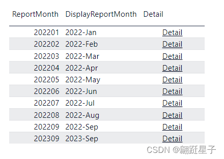 如下图所示,当点击最后一列的Detail链接,将跳转到详情页面,并查询出对应ReportMonth的详细数据: