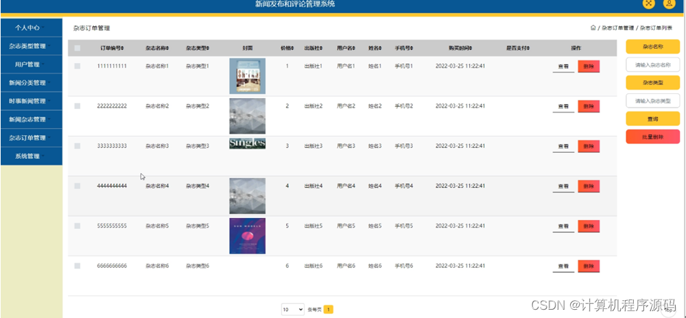 杂志订单管理,在杂志订单页面可以对订单编号,杂志名称,杂志类型,封面,价格,出版社,用户名,姓名,手机号,购买时间,是否支付等信息进行查看和删除操作,如图5-11所示。