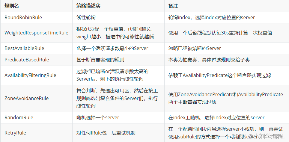 Ribbon支持的负载均衡策略 Ribbon内置了多种负载均衡策略,内部负载均衡的顶级接口为 com.netflix.loadbalancer.IRule , 具体的负载策略如下图所示: