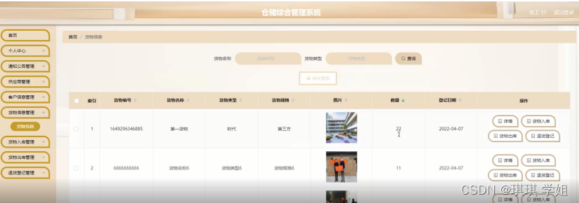 货物信息管理;在货物信息管理页面中可以查看货物编号、货物名称、货物类型、货物规格、图片、数量、登记日期等内容,并进行详情等操作;如图4-18所示。