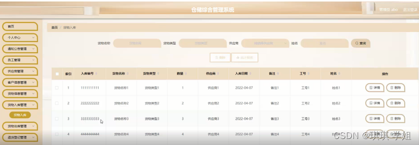 货物入库管理;在货物入库管理页面中可以查看入库编号、货物名称、货物类型、数量、供应商、入库日期、备注、工号、姓名等内容,并进行详情操作;如图4-19所示。