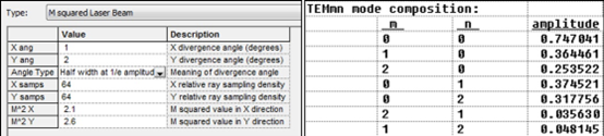 “M平方激光束”光源类型基于其M2因子模拟一个激光,,也被称为光束质量或光束传播因子。M2最小的可能值是1,这会指定一个高斯TEM00光束。M2的更大值表明在光束中高阶模的混合。为了确定在FRED中创建的M2光束的模式组成,在树上右键点击源“detail report”,然后选择Detailed Analysis。