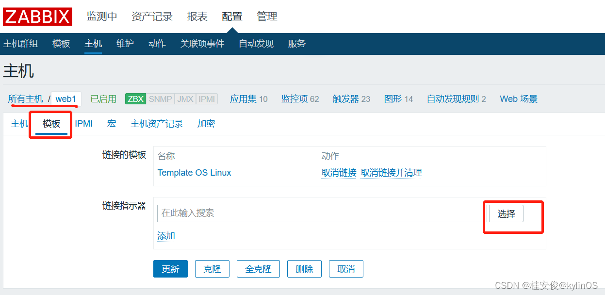以上是创建了一个基础监控模板,剩下就是将模板和被监控主机绑定,实现自动监控:
