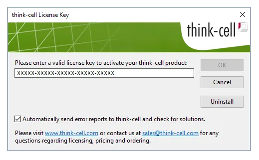 c.在 think-cell 许可证密钥窗口中输入有效的许可证密钥。