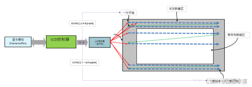 (2)关键点:LCD控制器和驱动器之间一次只能传一个像素点的显示数据。所以一帧图像在屏幕上其实是串行的依次被显示上去的,不是同一时间显示出来的。LCD显示的主要相关概念