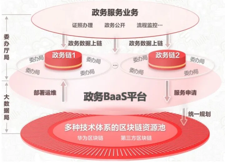 政务链:基于统一的区块链政务BaaS平台,面向大数据局和各业务部门创建独立的租户空间,业务部门可按需创建政务链。