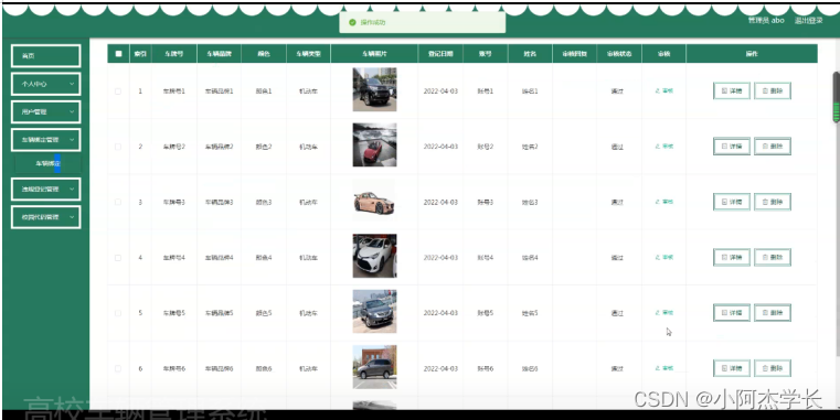 校园代码管理,在校园代码页面可以对索引,账号,姓名,身份,手机,车牌号,校园代码,发放时间等内容进行详情,修改和删除等操作,如图5-6所示。