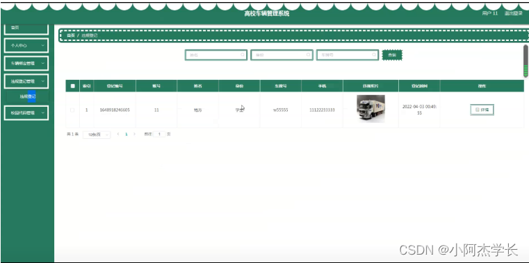 违规登记管理,在违规登记页面可以对索引,登记编号,账号,姓名,身份,车牌号,手机,违规照片,登记时间等内容进行详情,修改和删除等操作,如图5-5所示。