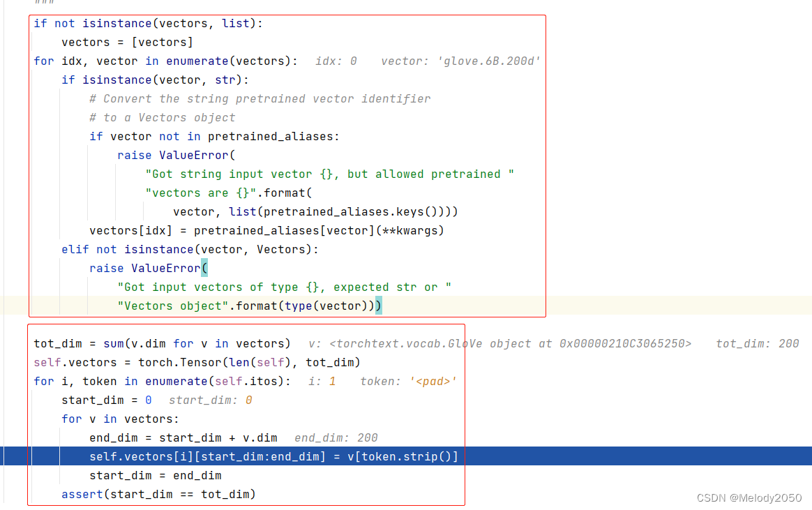 Field::vocab_cls在最后调用了load_vectors,其作用顾名思义,只是为了将词向量从已训练词库(本文是"‘glove.6B.200d’")中读出,并赋值给self.vectors。每个单词序号都有对应的词向量(包括特殊词汇、)
