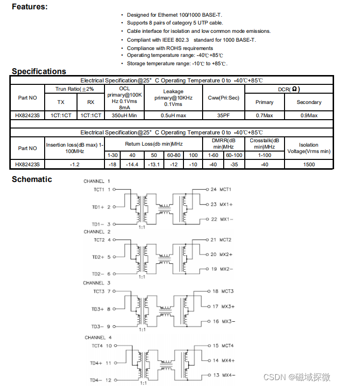 网络变压器生产工厂石门盈盛(华强盛)电子提供的带网络变压器型号: 台达国产替代SMT(贴片型) 千兆网络变压器型号: HX82423S, 对应台达产品型号为:LFE9219C-R,相关参数如后:
