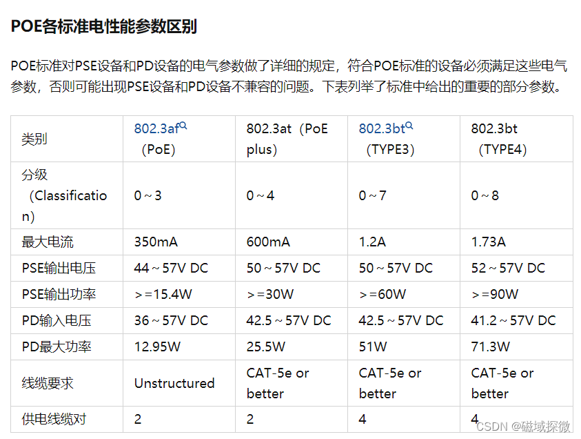 1、POE+最大功率支持上升到25.5W,部分厂家产品可以支持到50W,而POE可获得的功率为25.4W;