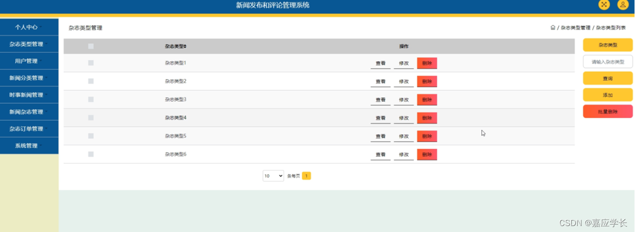 杂志类型管理,在杂志类型管理页面可以对杂志类型信息进行查看,修改或删除等操作,如图5-7所示。