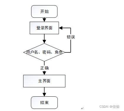 运行系统,首先进入登录界面,按照登录界面的要求填写相应的“用户名”和“密码”以及用户类型,点击“登录”然后系统判断填写是否正确,若正确进入相应的界面,否则给出要求先注册信息。具体流程如图5-1所示