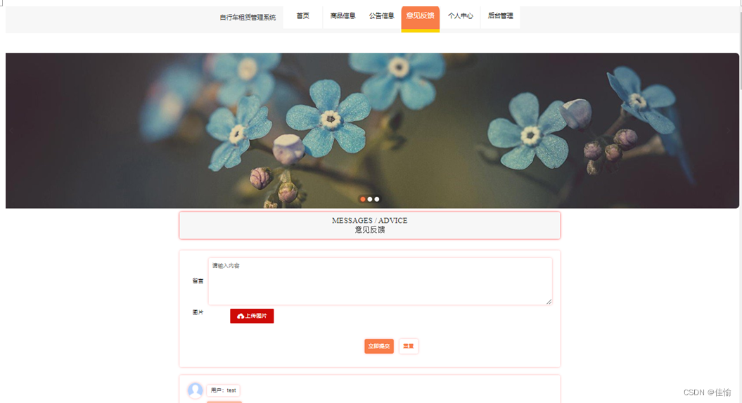 自行车租赁系统,在系统首页可以查看首页、商品信息、公告信息、意见反馈、个人中心、后台管理等内容,并进行详细操作;如图5-3所示。