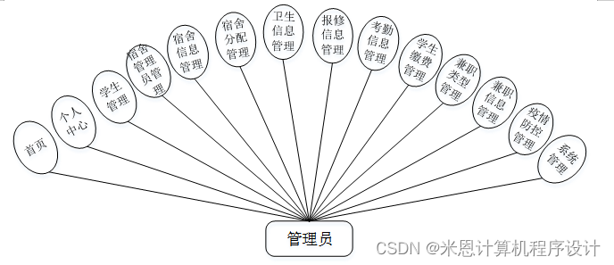 (3)后台模块中的用户角色是管理员、学生和宿舍管理员,管理员通过系统对可以实现系统管理,主要包括首页、个人中心、学生管理、宿舍管理员管理、宿舍信息管理、宿舍分配管理、卫生信息管理、报修信息管理、考勤信息管理、学生缴费管理、兼职类型管理、兼职信息管理、疫情防控管理、系统管理等功能。管理员模块用例图如图3-3所示。