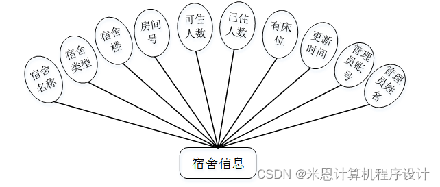 宿舍信息实体包括宿舍名称、宿舍类型、宿舍楼、房间号、可住人数、已住人数、有床位、更新时间、管理员账号、管理员姓名等属性。宿舍信息实体图如图4-4所示: