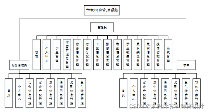 学生宿舍管理系统主要有3类用户。分别是管理员、学生和宿舍管理员,详细规划如图4-1所示。