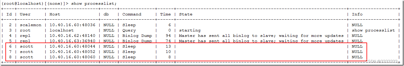 (root@localhost)[(none)]> grant replication slave, replication client on *.* to scalemon@'%' identified by '123456';
