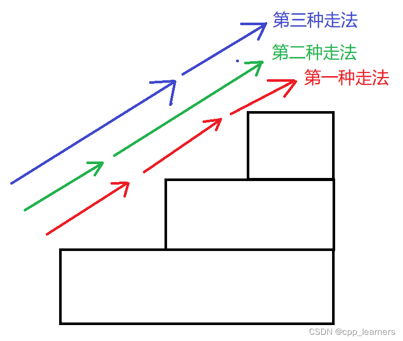 假设有一个三级台阶,我们一次可以走一步,或者一次走两步,那么由此可知,一共有3中走法,如下图