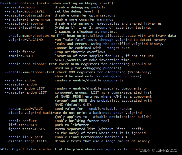 10,configure 脚本提供了各种裁剪功能,例如可以只启用某个编解码器,其他的编解码器全部不要,这样能大大缩小可执行文件的体积。
