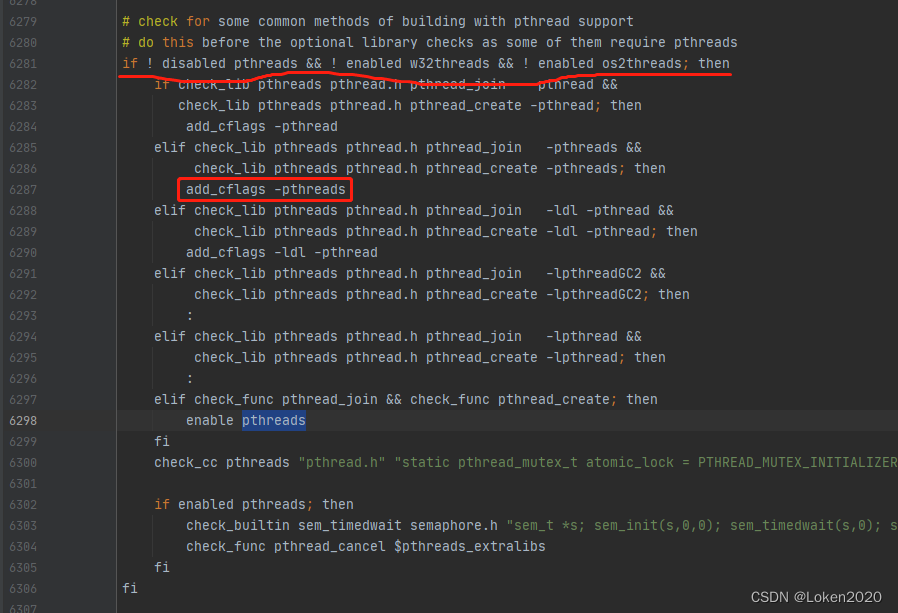从上图可以看到 pthreads 等于 yes 的时候,就会 加上 -pthreads 选项给链接器,我们设置成 no,就不会跑进去上面的逻辑,也就没有 -pthreads 选项。