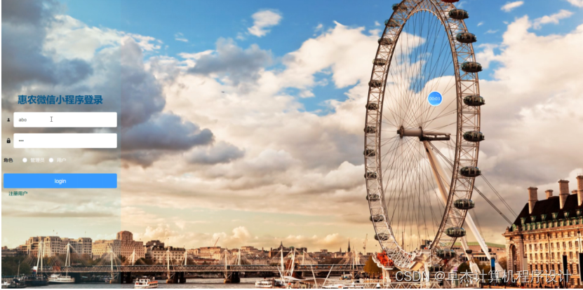 惠农微信小程序登录界面,通过填写账号、密码、登录用户类型等信息进行登录,如图5-1所示。