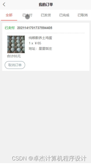 我的订单,在已支付页面可以查看订单编号、商品名称、商品图片、购买数量、价格、状态、地址等信息,并可以对已发货、已完成、已取消等信息进行相对应操作,如图5-9所示。