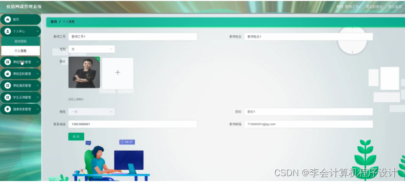 个人中心;在个人信息页面通过填写教师工号,教师姓名,行不,照片,班级,联系电话,教师邮箱等内容并提交进行个人信息修改操作;如图5-11所示。
