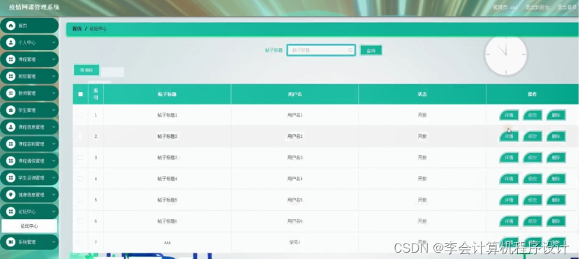 论坛中心管理;在论坛中心管理页面中可以对索引,帖子标题,同户名,状态等内容进行详情,修改和删除操作;如图5-9所示。