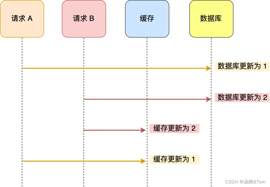 A 请求先将数据库的数据更新为 1,然后在更新缓存前,请求 B 将数据库的数据更新为 2,紧接着也把缓存更新为 2,然后 A 请求更新缓存为 1。