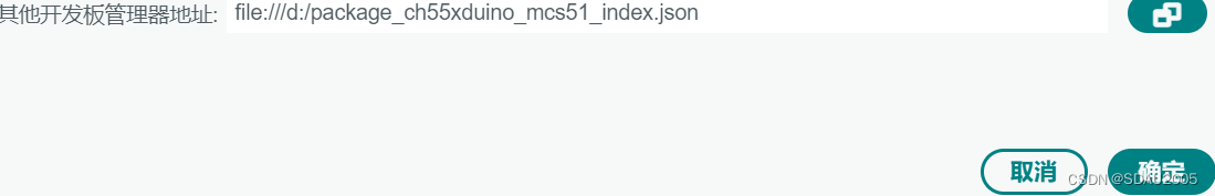 下右侧“Releases->Latest”,下载“package_ch55xduino_mcs51_index.json”到D盘,文件->首选项->其他开发板管理器地址,添加“file:///d:/package_ch55xduino_mcs51_index.json”,如下图: