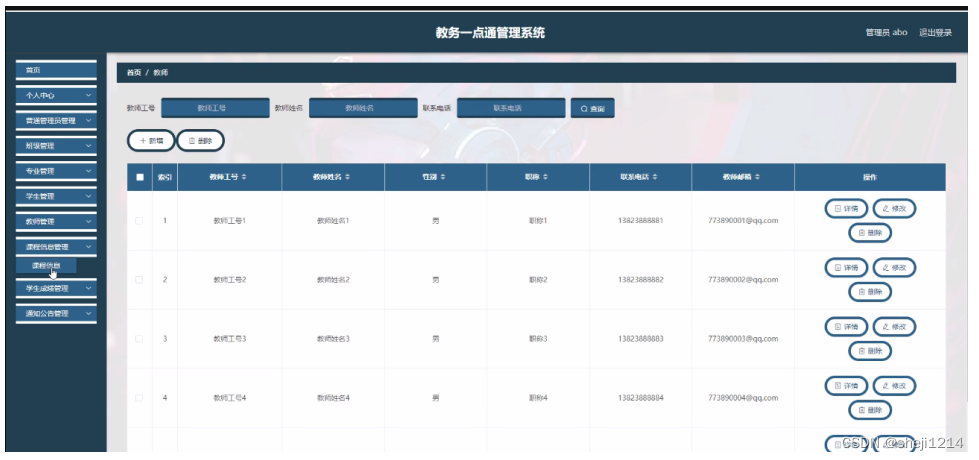 教师管理,管理员可在教师管理页面查看教师工号、教师姓名、性别、职称、联系电话、教师邮箱等内容,还可进行新增、修改或删除等操作,如图5-6所示。