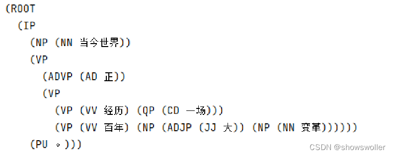 假定对象文本分析为“当今世界正经历一场百年大变革” 利用斯坦福句法程序分析得到的句法结构如下