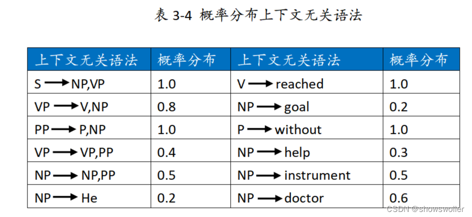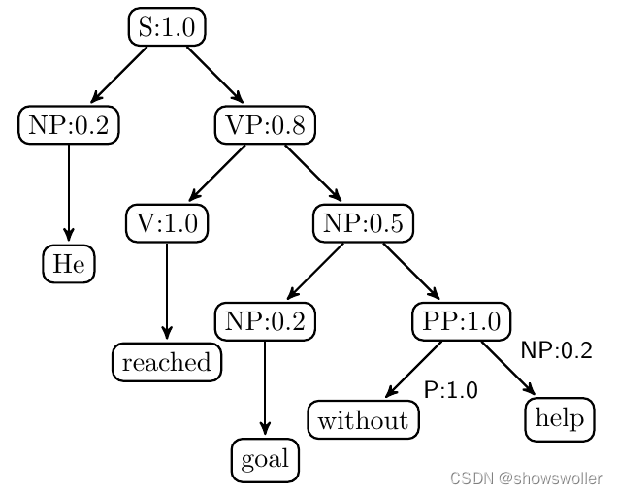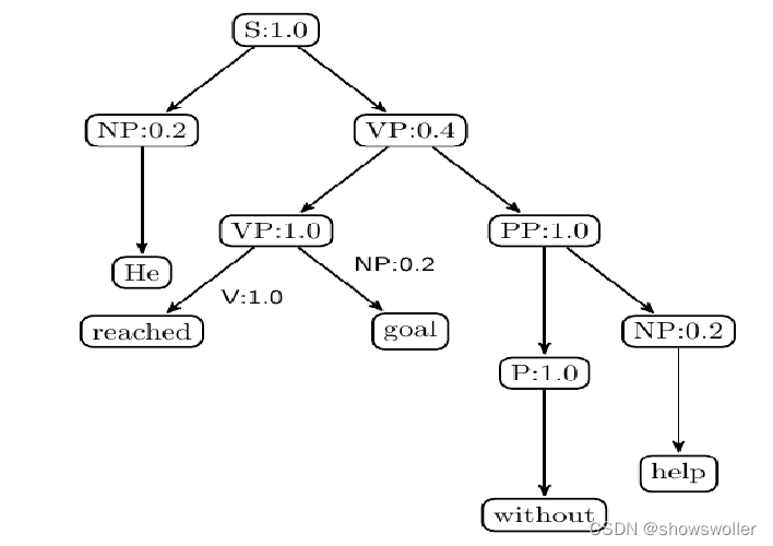 根据概率分布上下文无关语法得出该句法树的概率为: P2=P(S)×P(NP)×P(VP)×P(VP)×P(V)×P(NP)×P(PP)×P(P)×P(NP) =1.0×0.2×0.7×1.0×1.0×0.2×1.0×1.0×0.2=0.0056