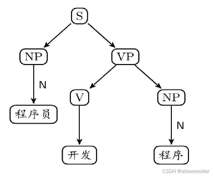 在计算机中,可以用树状结构图来表示文本结构,使用字符S代表句子,NP VP PP分别代表名词短语 动词短语 介词短语 N V P M则分别是名词 动词 介词 数量词和时量词