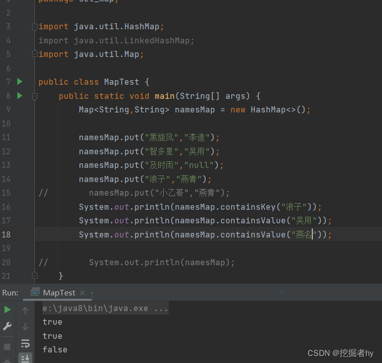 boolean containsKey(K key):在当前Map集合中是否包含指定的key值