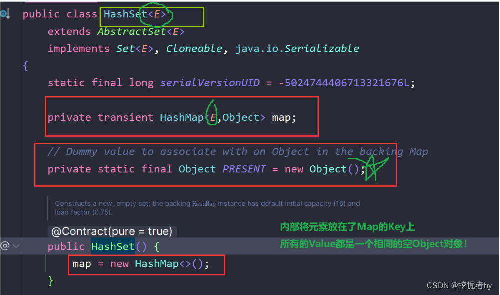在源码中,内部将元素放在Map的key上,所有的value都是一个相同的空的Object对象