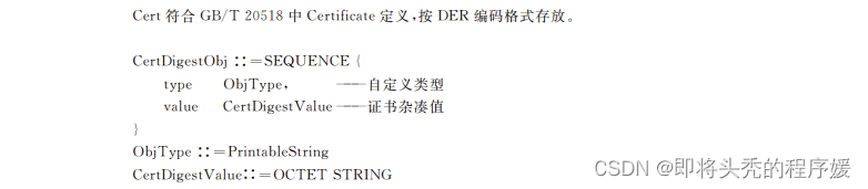 cert:对电子印章进行签名的制章者的数字证书,应符合GB/T 20518中Certificate定义,按DER编码格式存放