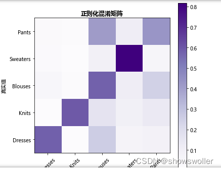 由上图可知,对角线上的值表示正确分类的结果,颜色越深数字越大,分类结果越正确,非对角线上的值表示模型错误分类结果,颜色越深数值越大,被错误分类的概率越大,可见模型对Sweaters类型的预测分类结果准确性最高,其他略低。