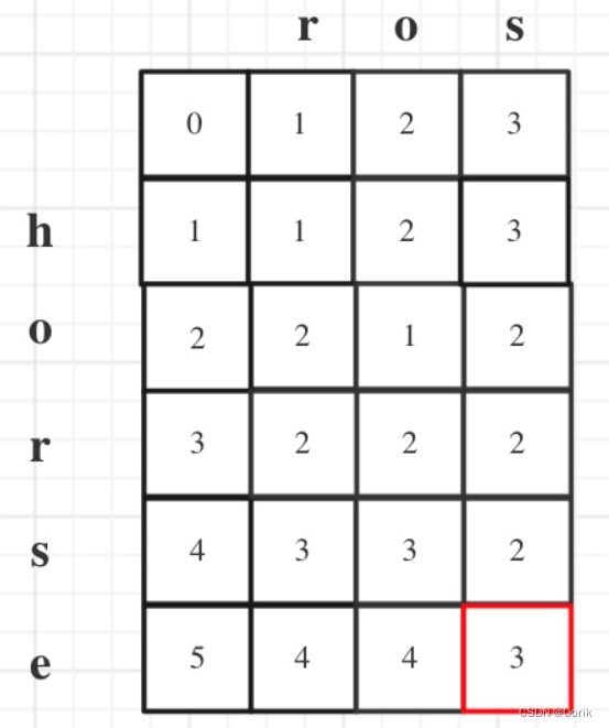 以 word1 为 "horse",word2 为 "ros",且 dp[5][3] 为例,即要将 word1的前 5 个字符转换为 word2的前 3 个字符,也就是将 horse 转换为 ros,因此有: