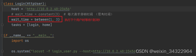 每个模拟用户定义的类,都必须继承HttpUser,目的时为每个用户提供一个client属性,该属性是一个实例HttpSession,可用于向我们要进行负载测试的目标系统发出HTTP请求