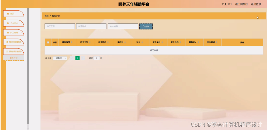 服务评价管理,护工可在服务评价管理页面查看预约编号、护工工号、护工姓名、手机号、特长、老人编号、老人姓名、服务地址、评价时间等内容,如图5-13所示。