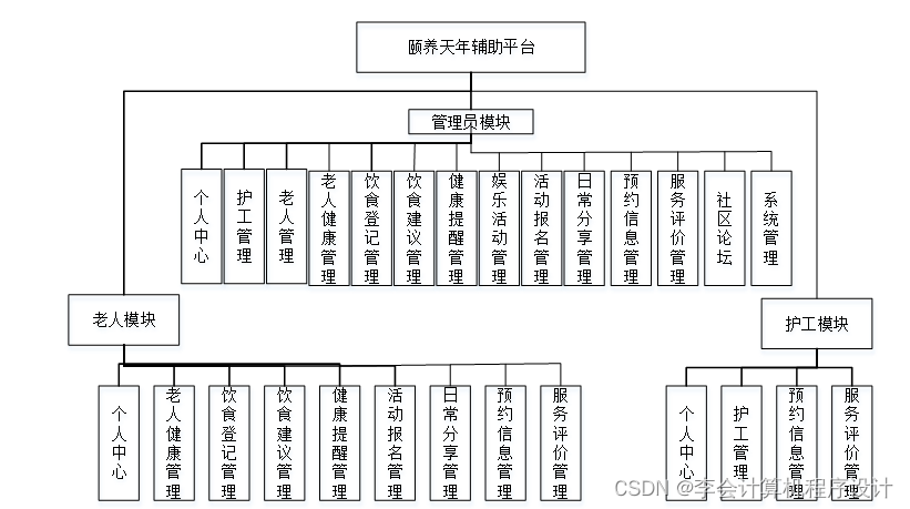 根据一般颐养天年辅助平台的功能需求分析,本系统的功能模块如下: