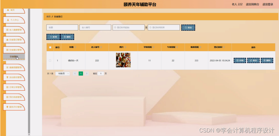 饮食登记管理,老人可在饮食登记管理页面查看标题、老人编号、图片、早餐搭配、午餐搭配、晚餐搭配、登记时间等内容,还可进行新增、修改或删除等操作,如图5-7所示。