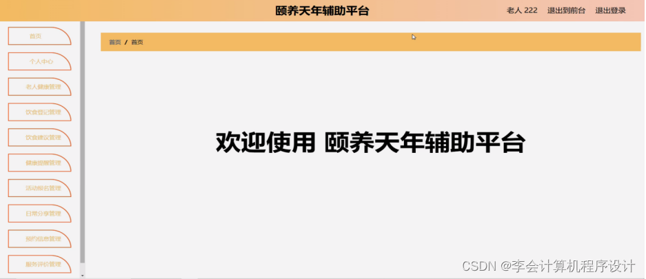 颐养天年辅助平台,在系统首页可查看首页、护工、娱乐活动、日常分享、社区论坛、系统公告、个人中心、后台管理、建议反馈等内容,如图5-1所示。