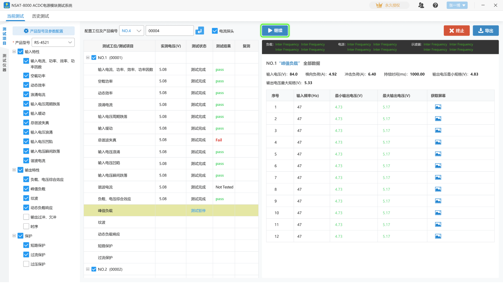 点击暂停按钮后,测试暂停,左侧列表会显示已测试完成的具体参数内容,如果需要继续测试,点击继续按钮。