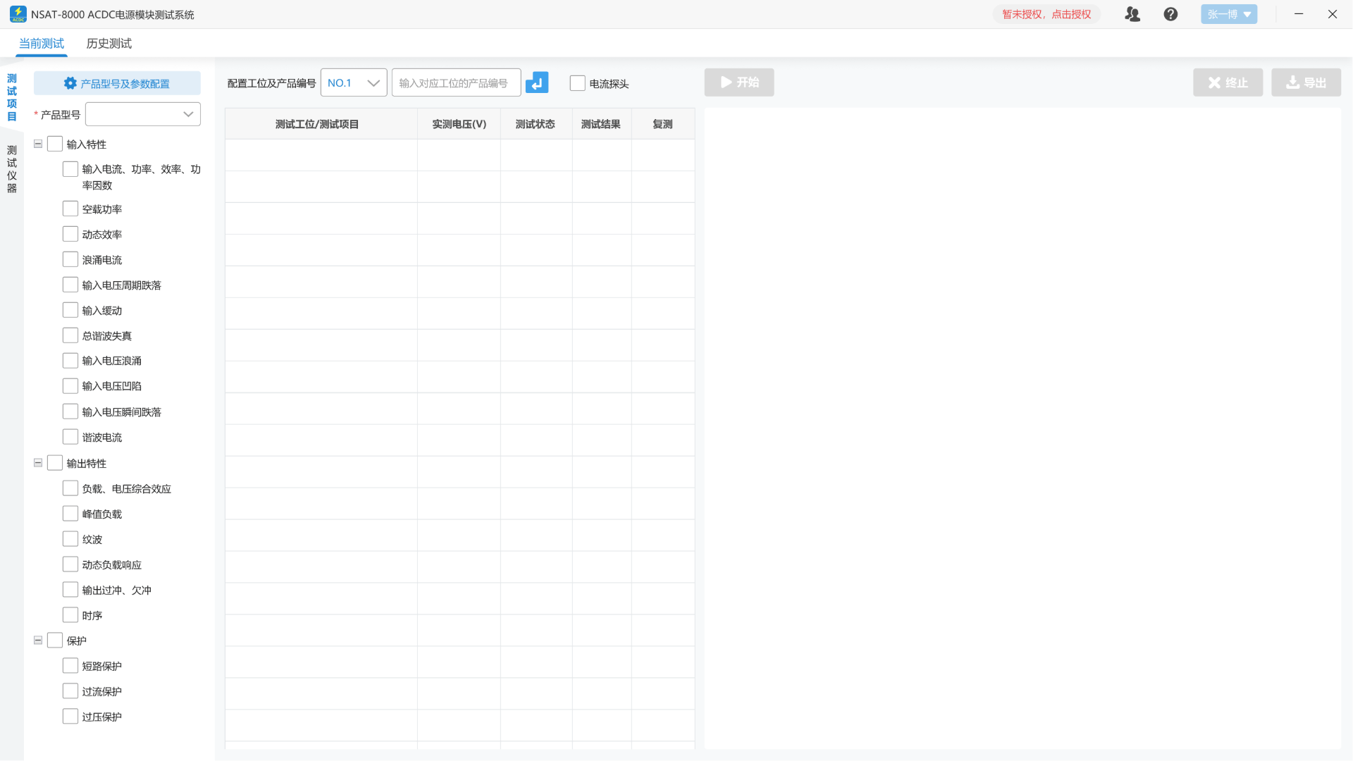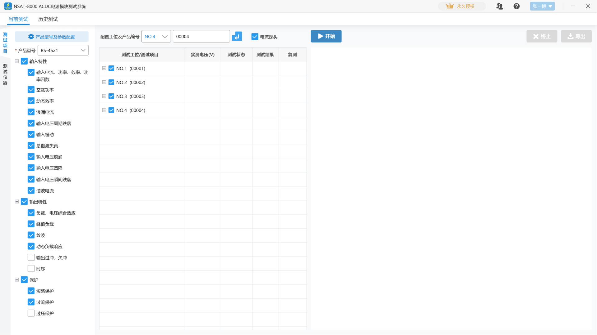 选择工位,输入对应工位的产品编号,点击回车,工位及产品编号显示在下方的表格内,编号全部输入后,勾选电流探头,点击界面右侧的开始按钮,开始测试。